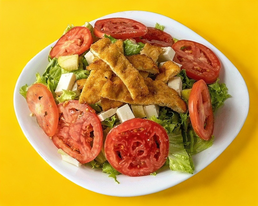 Mix de lechugas, totopos, aguacate, jitomate, pico de galllo, mayonesa y aderezo italiano