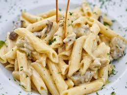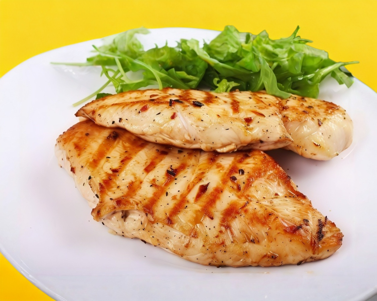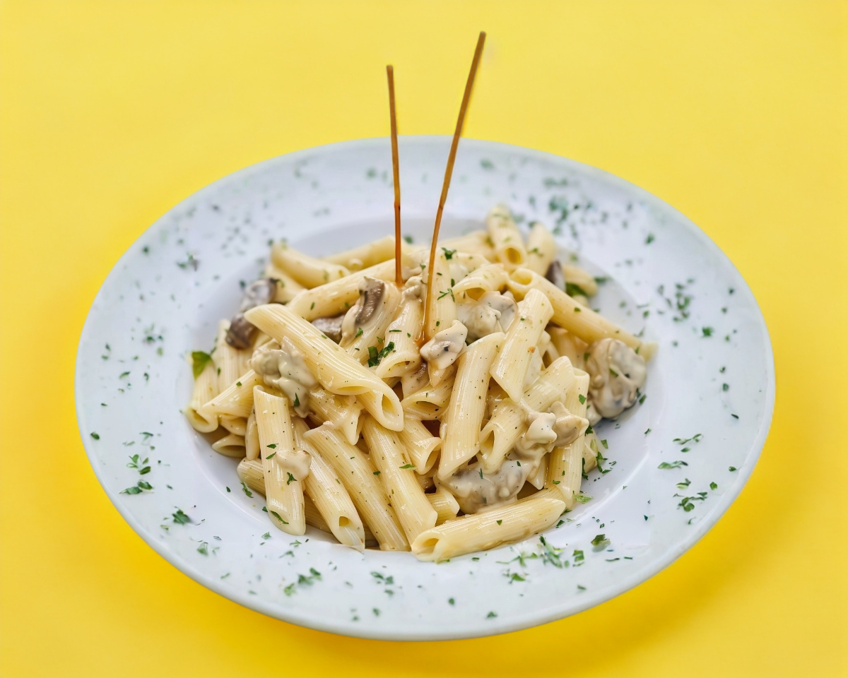 Fusilli en salsa de queso, pollo a la plancha y ensalada