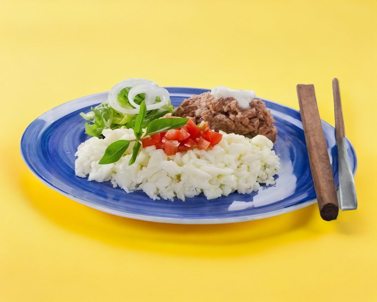 Filete salteado al mojó de ajo acompañado con arroz y ensalada.