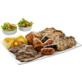 Plato con carne de res, pollo, chorizo, una quesadilla de harina, ensalda y frijoles