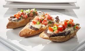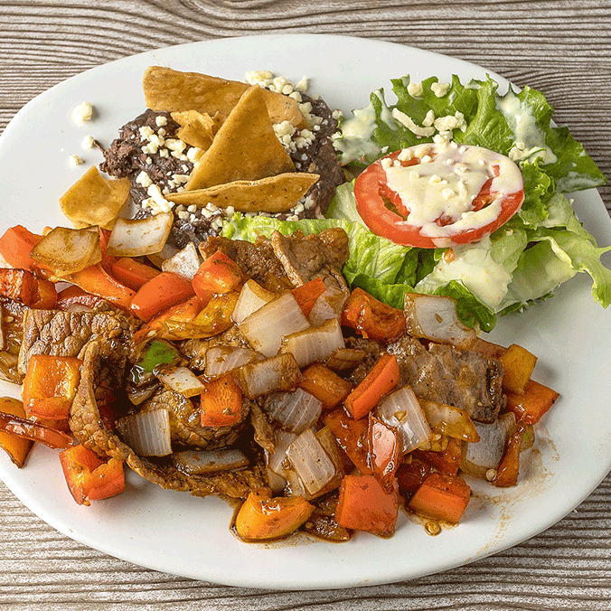 Bisteck cubierto de frijoles, queso gratinado, salsa verde y dos guarniciones