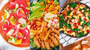 Pollo empanizado con verduras al vapor en salsa agridulce, acompañado con ensalada cesar.