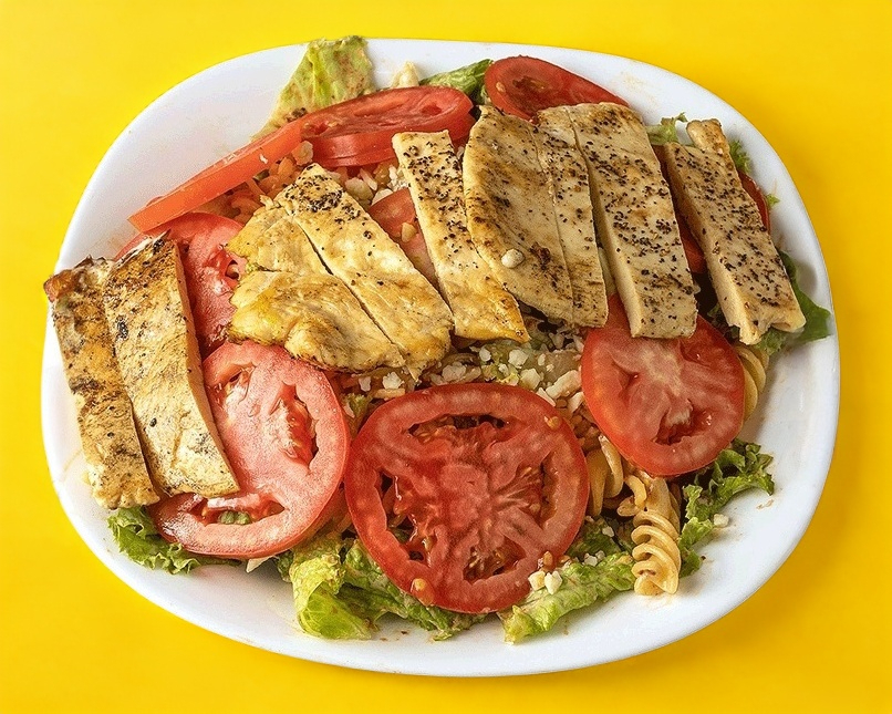 Mix de lechugas, pasta fusilli, jitomate, croutones, ad. ranch chipotle y pollo plancha