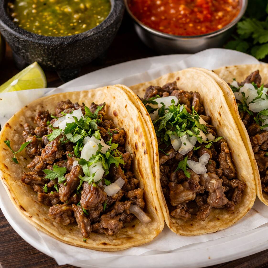 Tacos de bistec tortilla grande con cebolla, cilantro, limones y salsas.