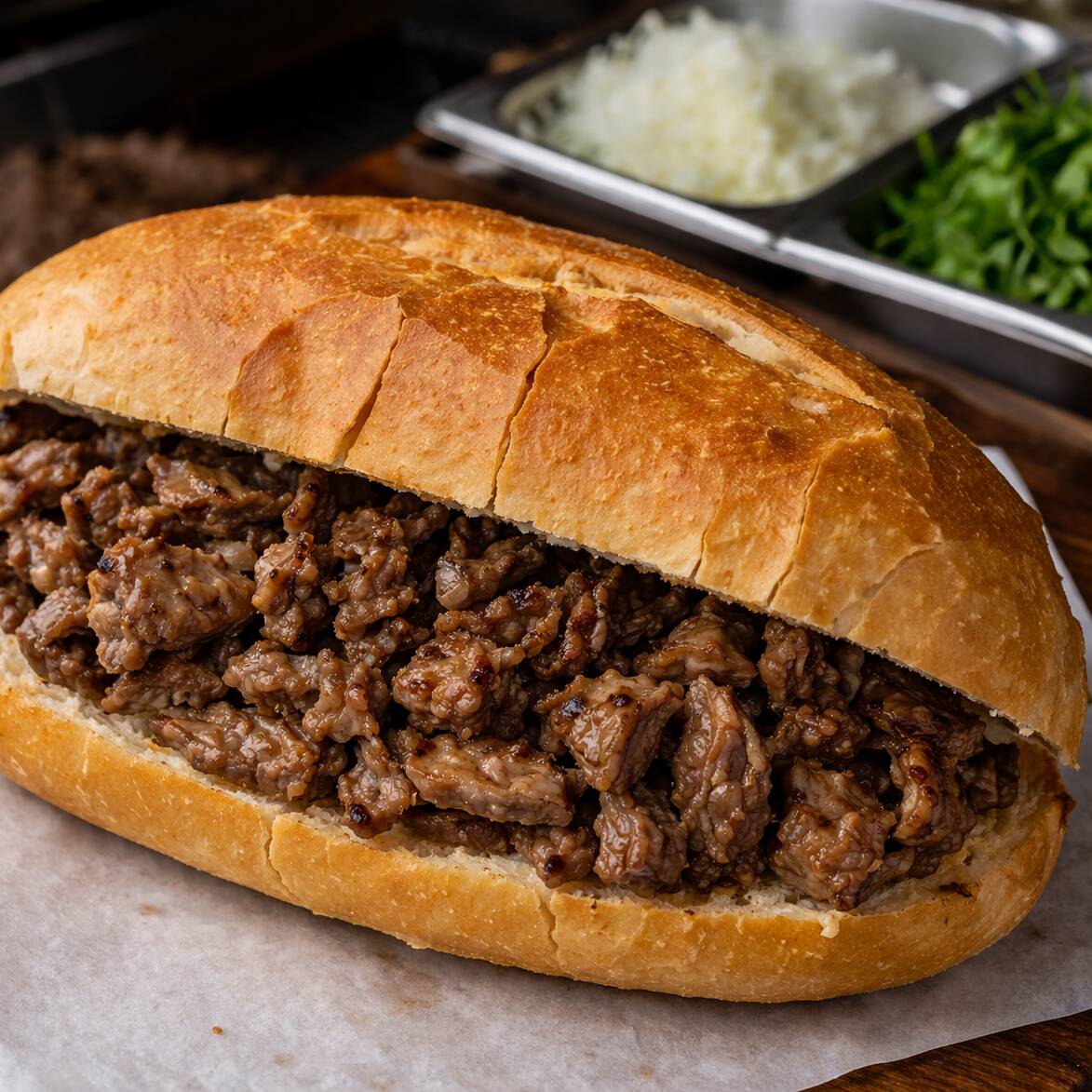 Torta de bistec bolillo grande con cebolla, cilantro, limones y salsas