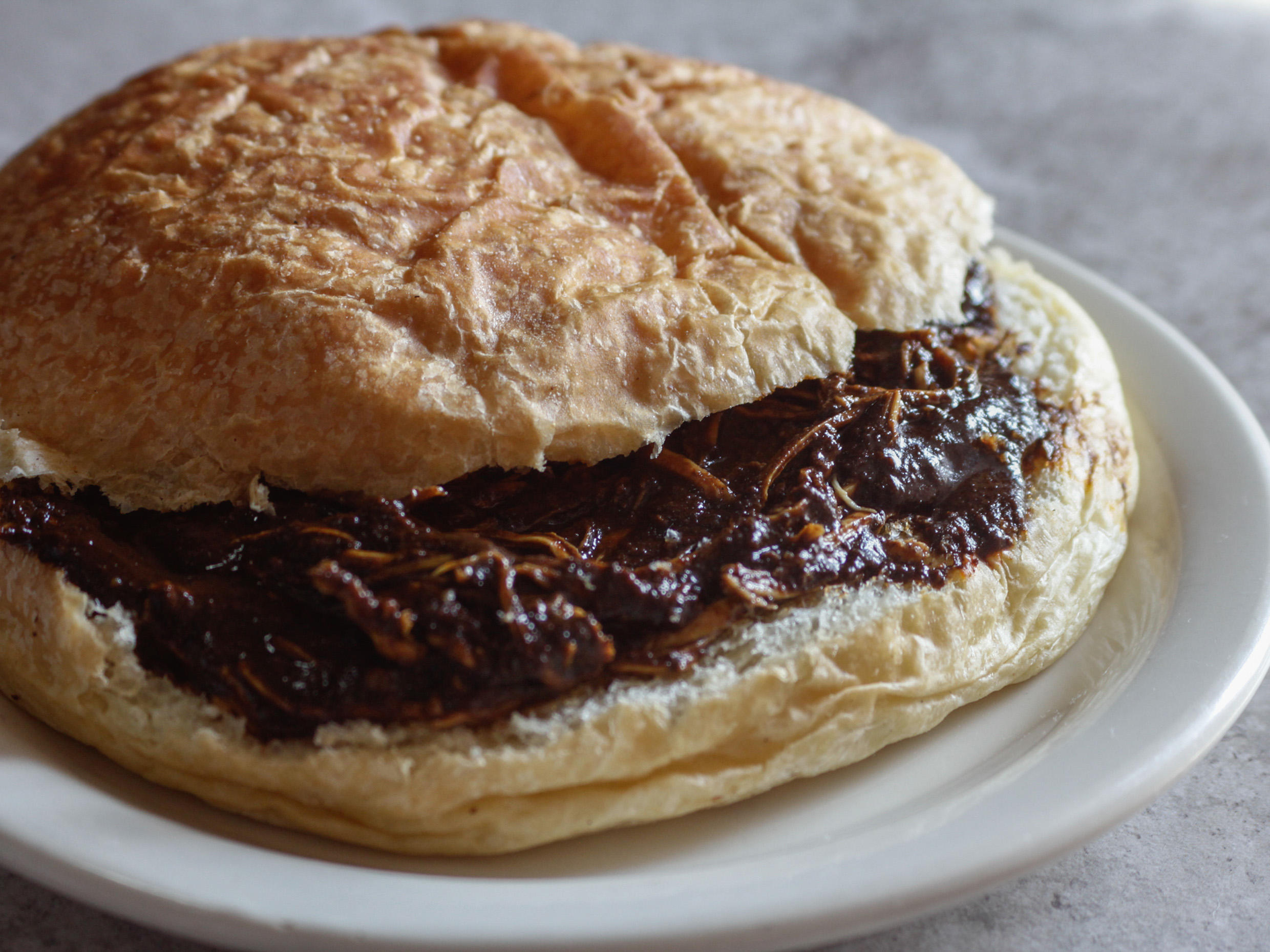 Pan de hojaldra, rellena de pollo con mole.