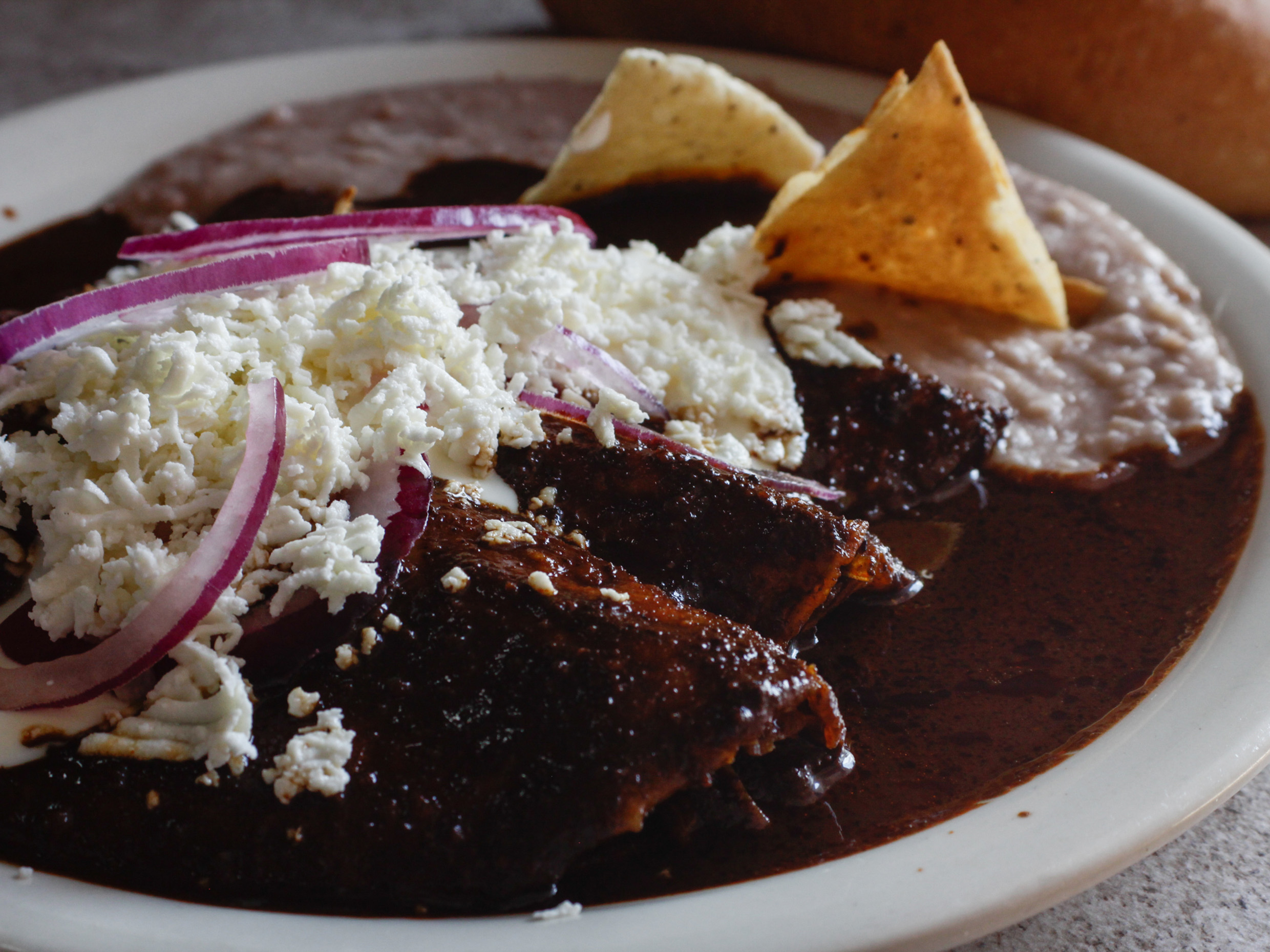Orden de 6 enmoladas, tortilla rellena de pollo, bañadas en mole, cubiertas con cebolla, crema y queso.