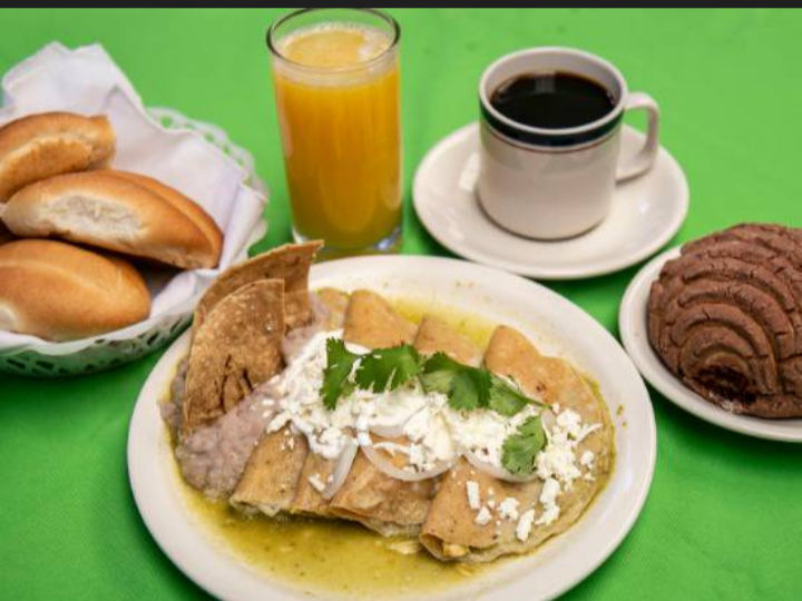 Chilaquiles ( con pollo o huevo), café de olla (vaso de 250 ml), jugo naranja, zanahoria o combinado (vaso de 250 ml).