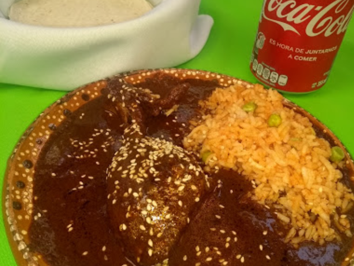 Pieza de pierna y muslo, bañada en mole, acompañada con arroz y frijoles refritos. incluye refresco o agua de sabor.