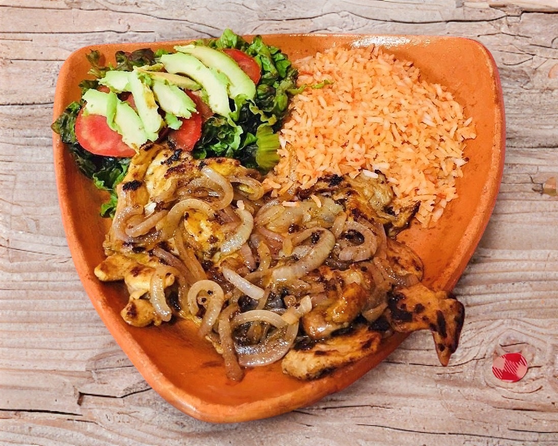 Bisteck asado con cebolla asada, acompañado de arroz, frijoles y tortillas (porción 1 persona)