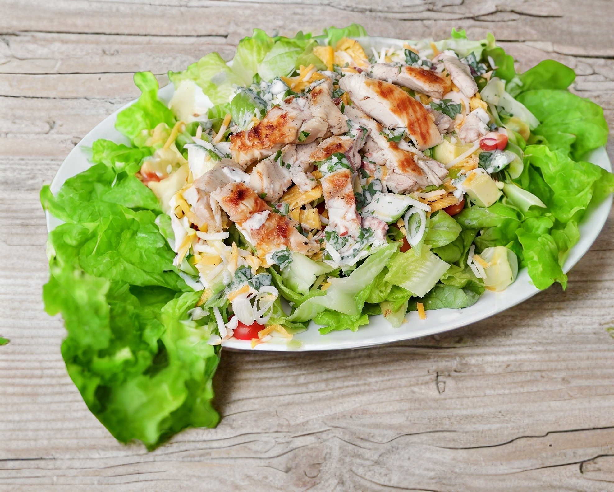 Pechuga de pollo asada en fajita, acompañada de Lechuga, Jitomate, Aguacate, Calabaza, Zanahoria, Crutones , Cebollia crujiente y aderezo. (Porción personal)