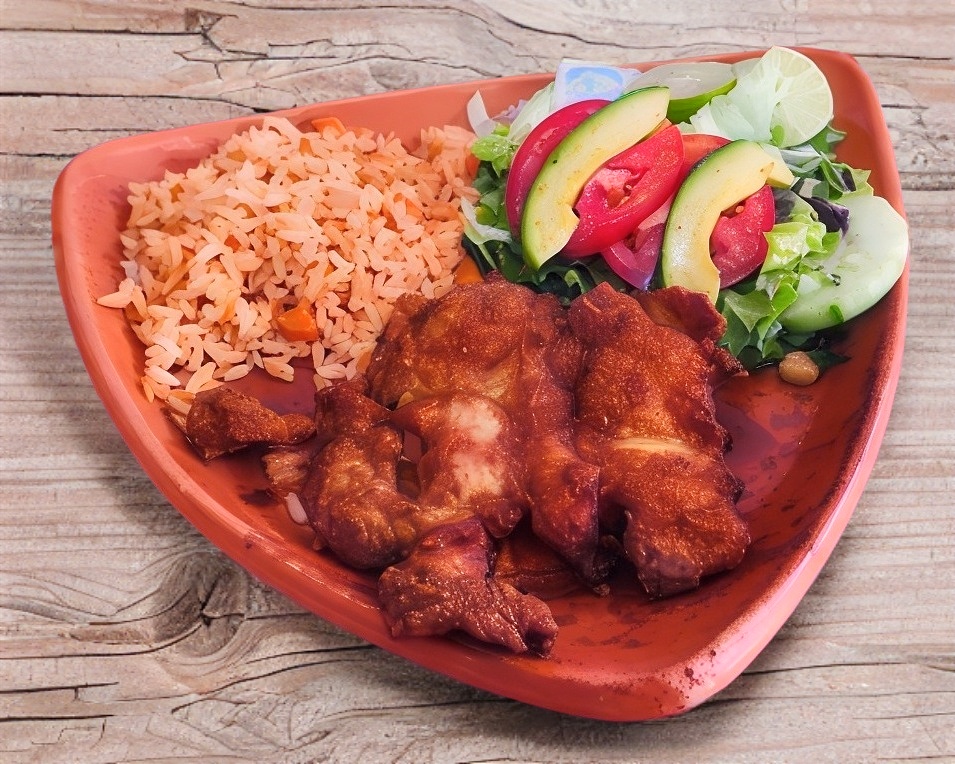 Milanesa de pollo, pierna, frijoles, jitomate, aguacate, mayonesa y chiles en vinagre ( porción 1 persona)
