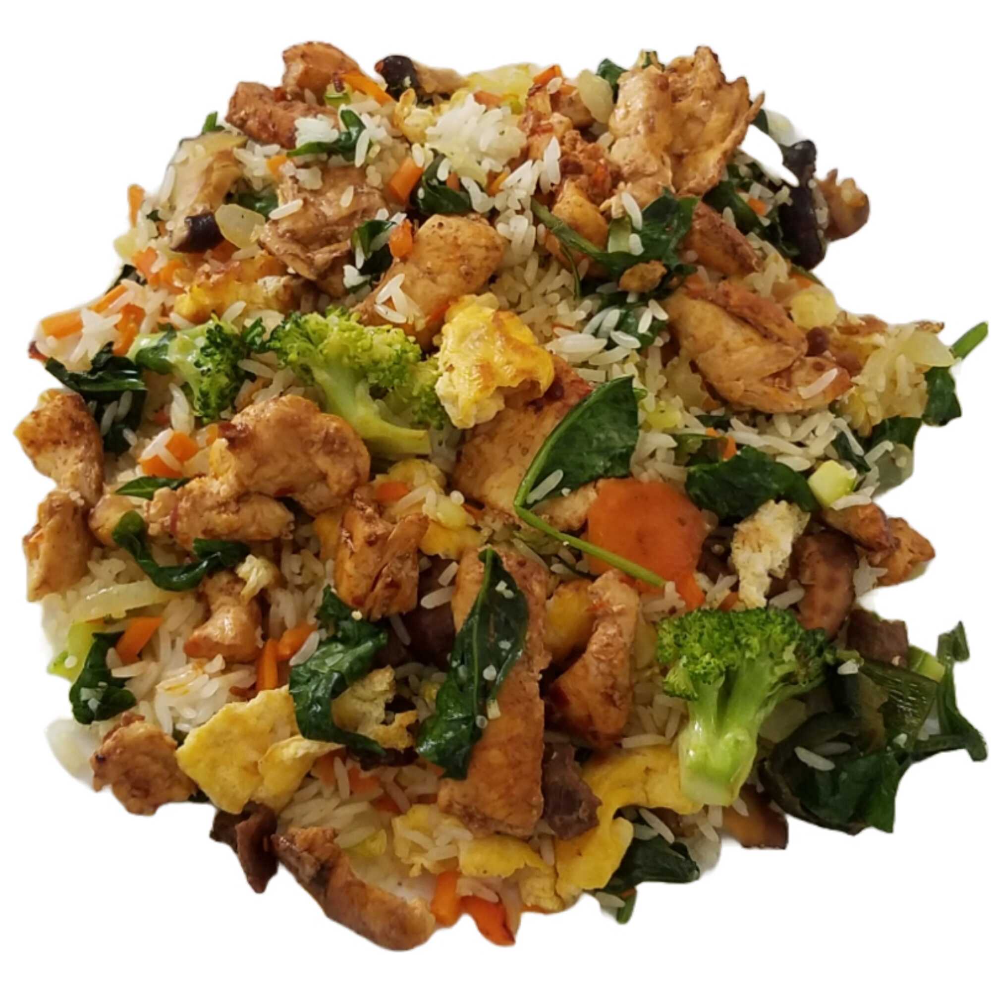 Arroz frito con pollo, champiñones, zanahoria, calabaza, huevo, espinaca y selección de especies. Fried rice with chicken strips, green squash, carrot, egg, spinach and spices selection. 鸡丝炒饭 鸡肉,西葫芦,胡萝卜,鸡蛋,菠菜,香菇,洋葱