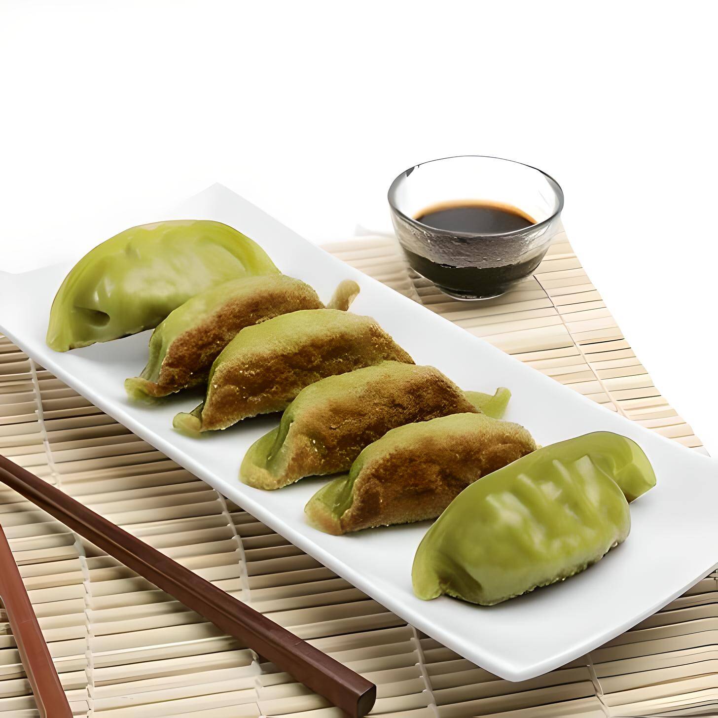 Dumpings fritos veggie con champiñones, zanahoria, calabaza, huevo, espinaca y selección de especies.Dumplings with mushrooms, carrots, pumpkin, eggs, spinach and spices selection.素饺子 7个: 香菇,胡萝卜,西葫芦,鸡蛋,菠菜,洋葱
