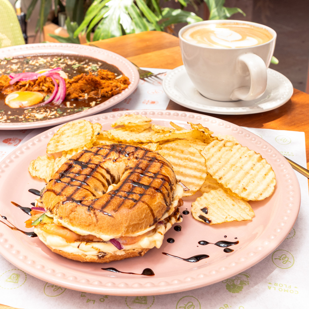 Delicioso bagel relleno con queso philadelphia, hierbas, alcaparras, cebolla morada y salmón ahumado acompañado con nuestra selección de chips