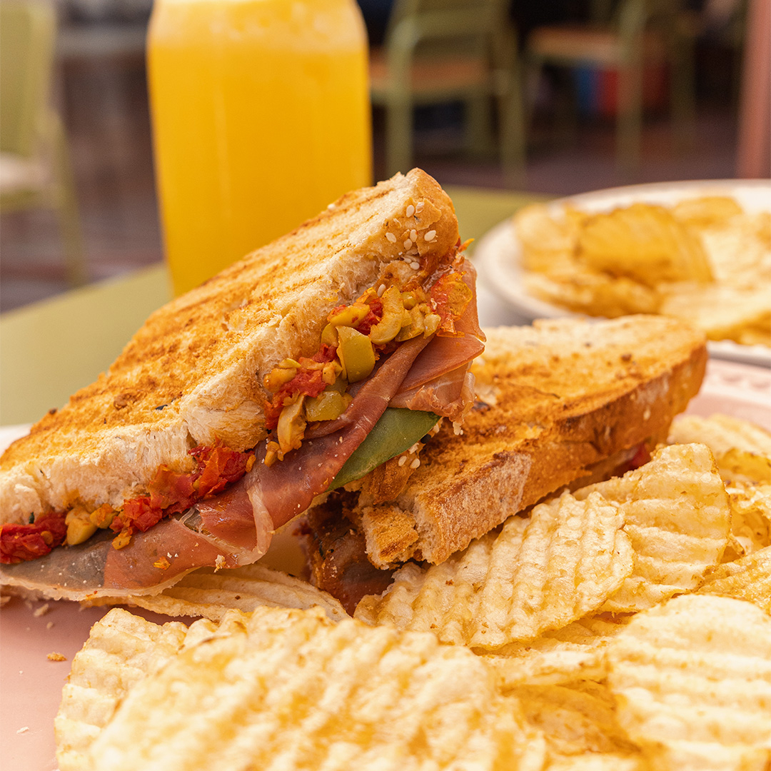 Sangüish de jamón serrano, espinacas, jitomate deshidratado y selección de aceitunas, acompañado con chips de la casa.