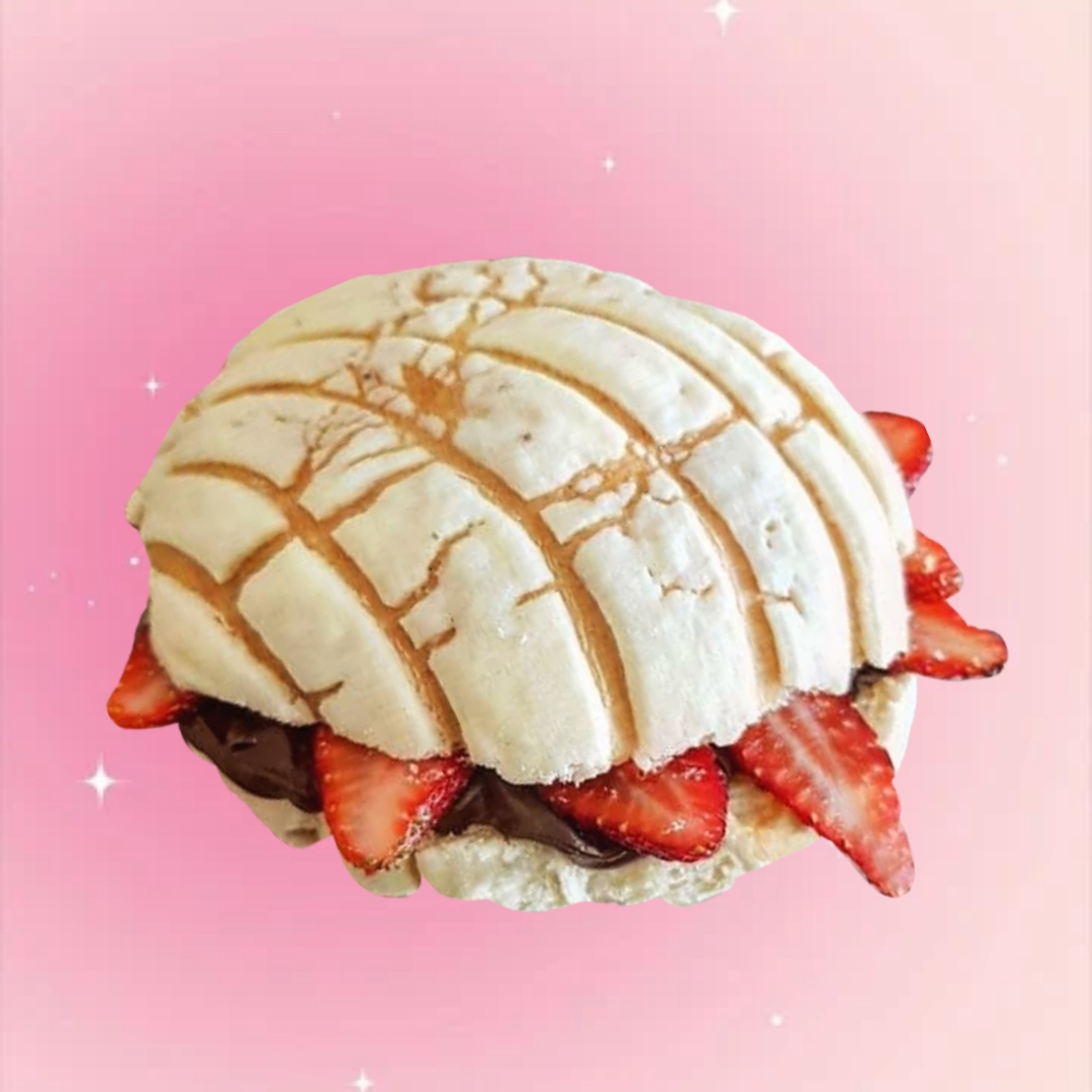 Concha de vainilla rellena de fresa, durazno o plátano + 1 base,1 cubierta y 1 toping