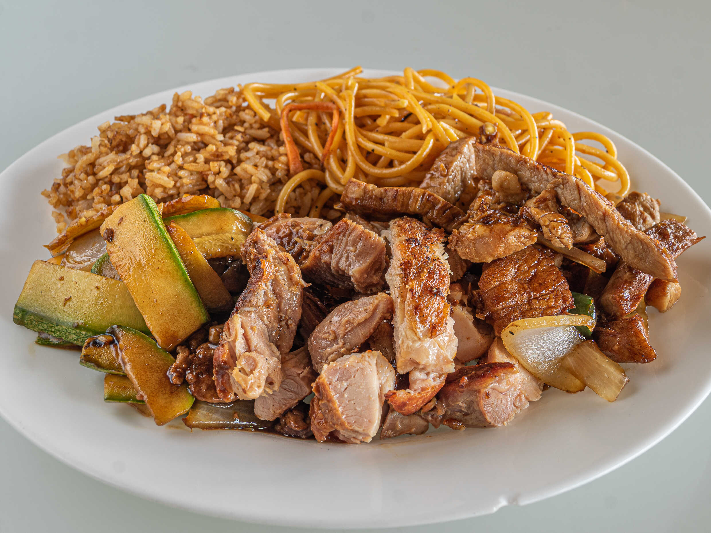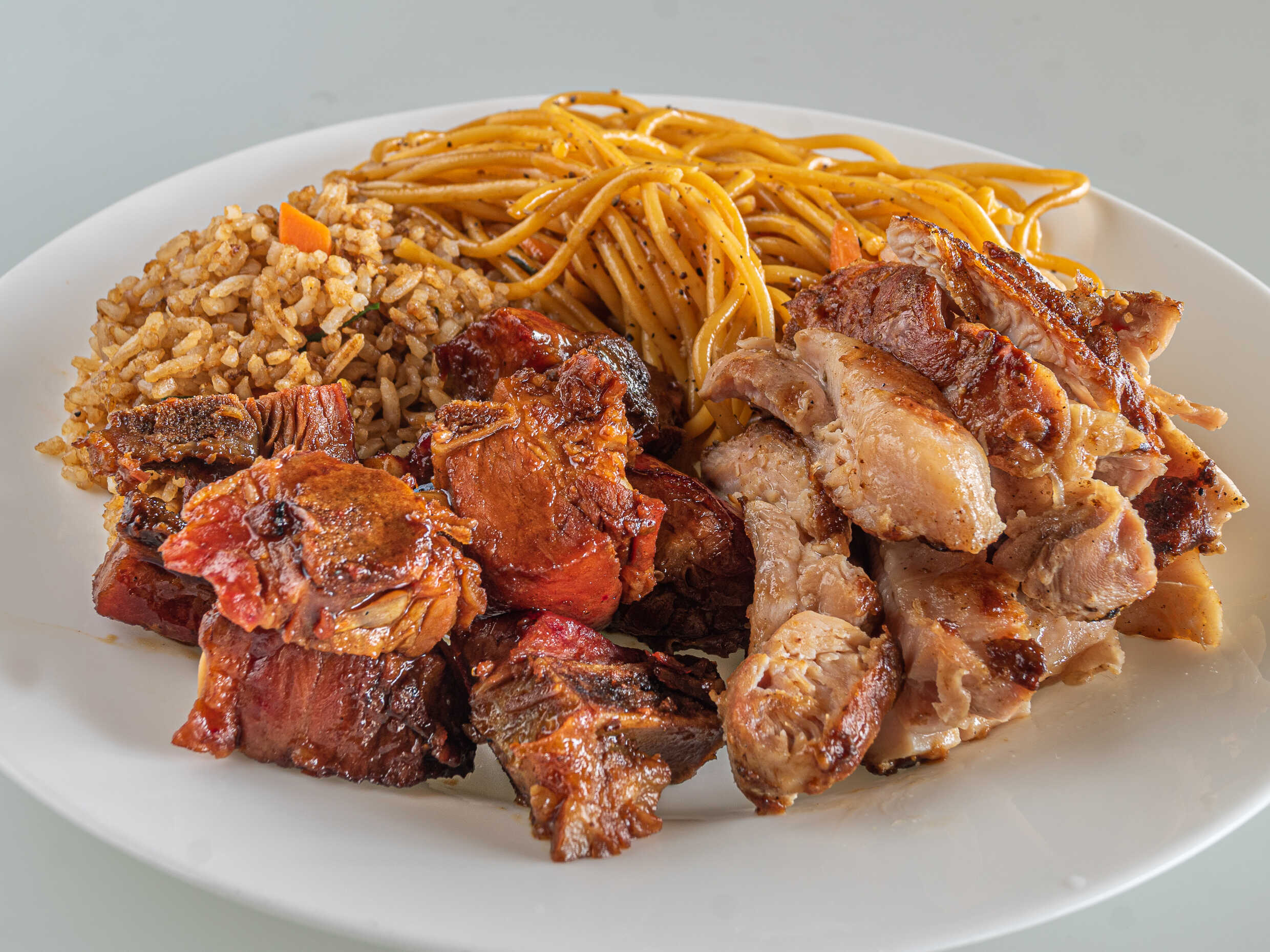 Arroz, espagueti y 3 guisados de carne.
