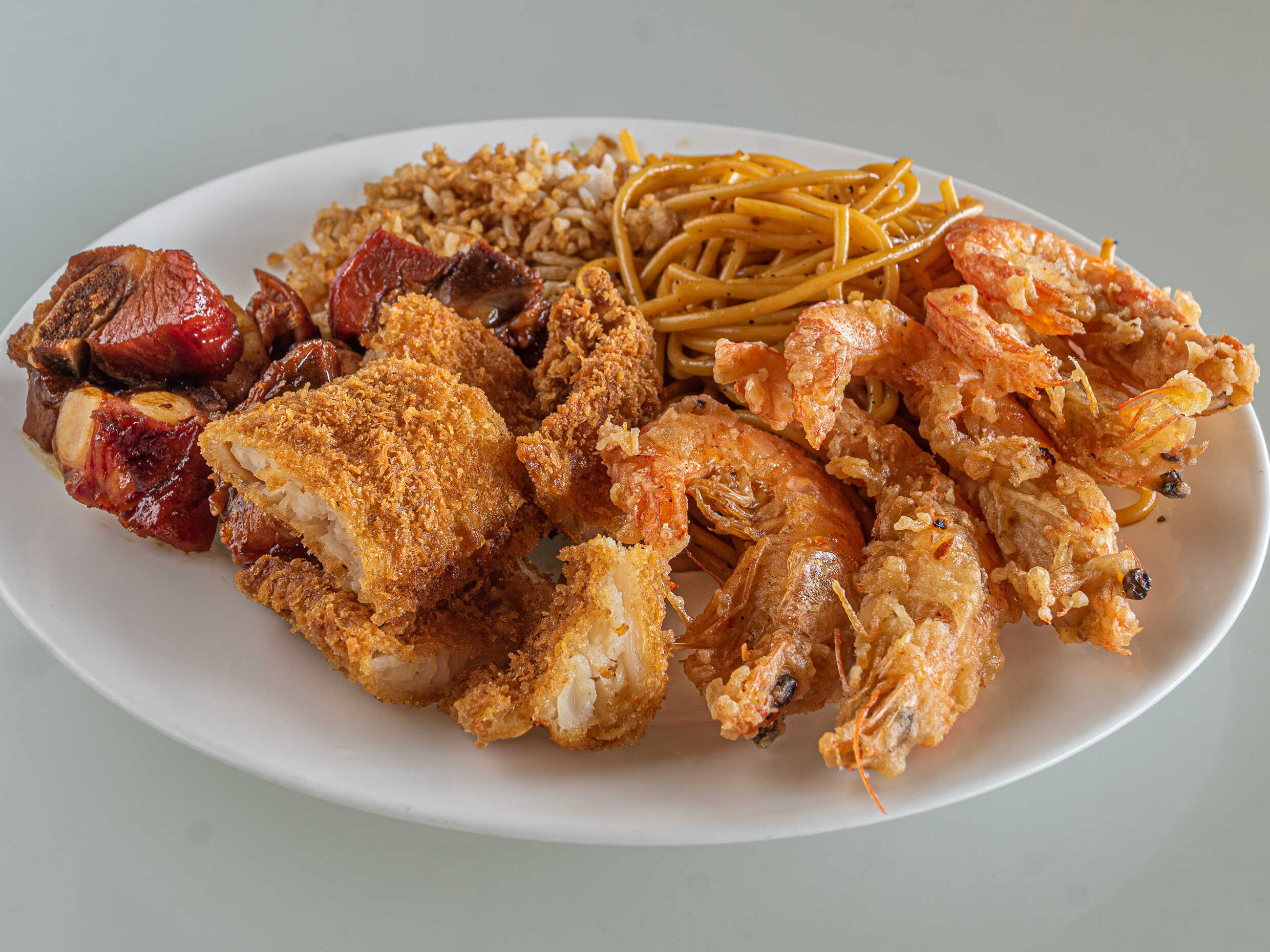 Arroz, espagueti, 1 guisado de verdura y 2 guisados de carne.