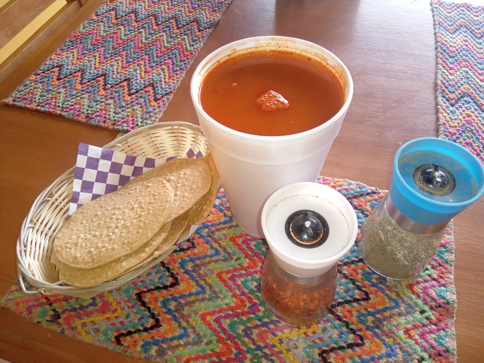 Pozole de litro, verde, blanco y rojo.