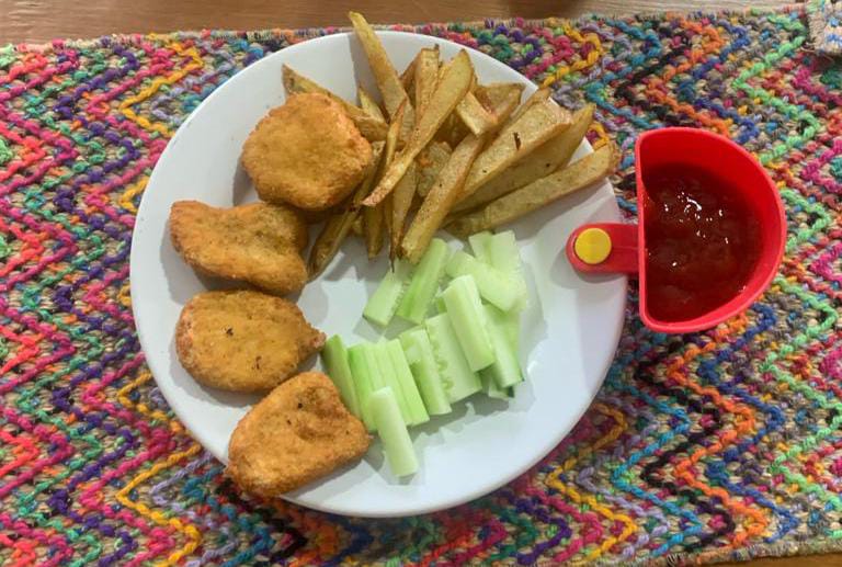 Nuggets de pollo, acompañados de pepino y papas a la francesa.