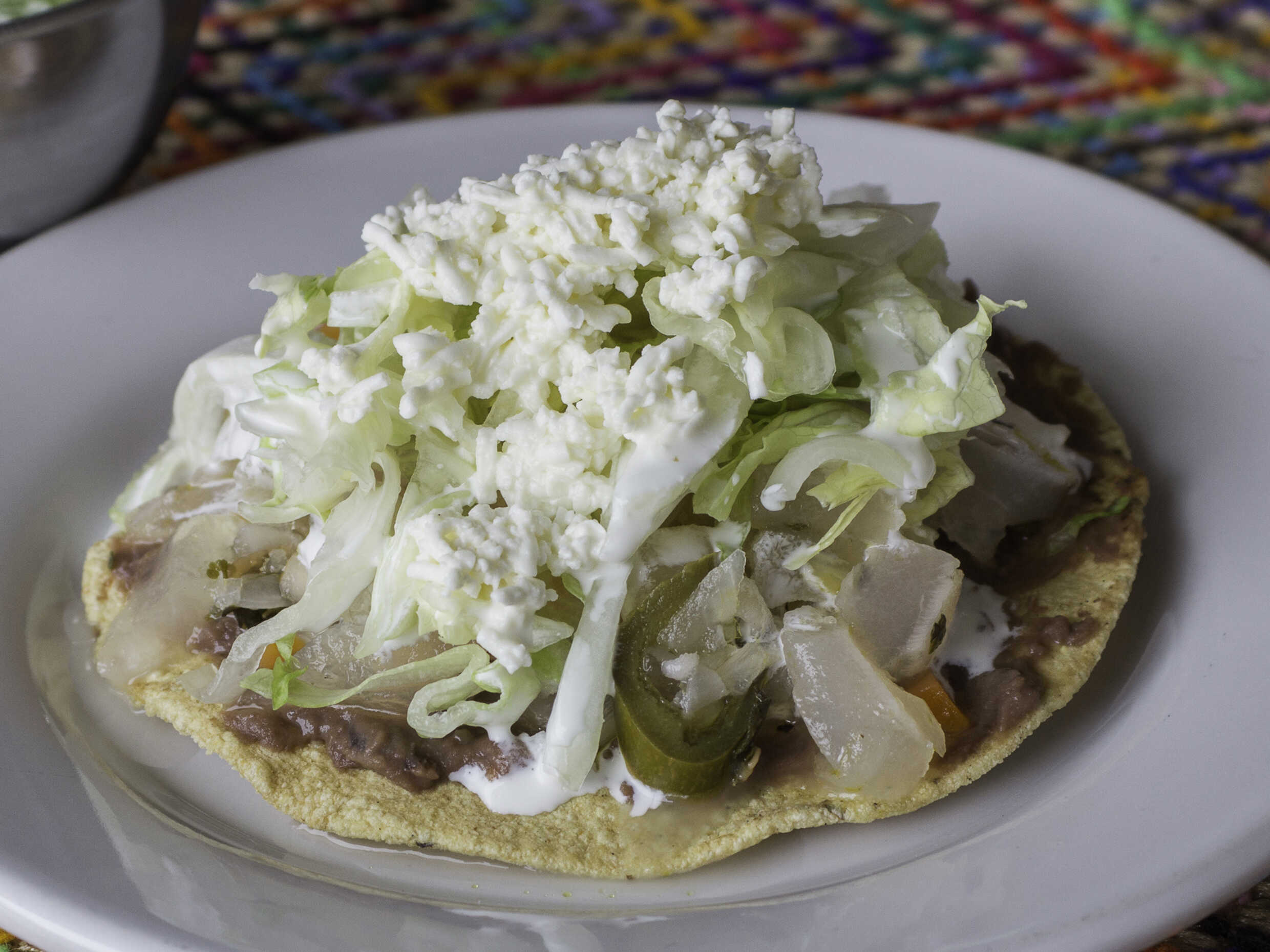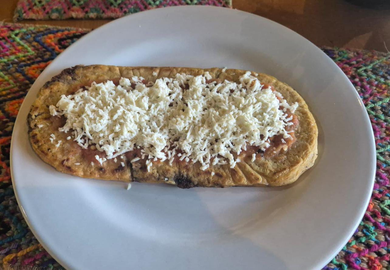Tortilla de masa con una cama de frijol, salsa y queso.