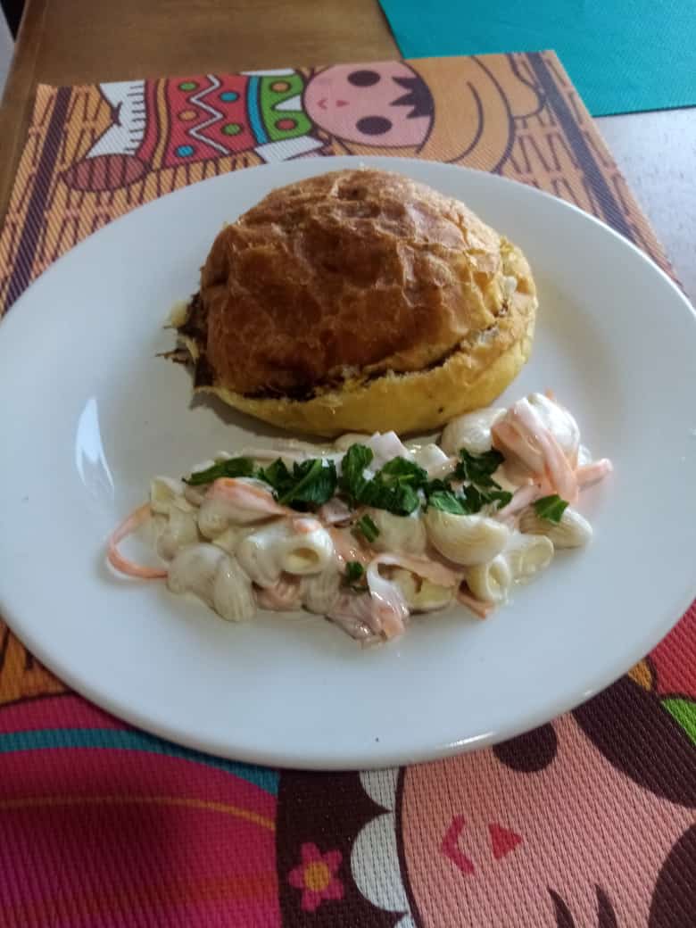 Pambazo relleno de papa con chorizo, servido con lechuga, queso y crema.