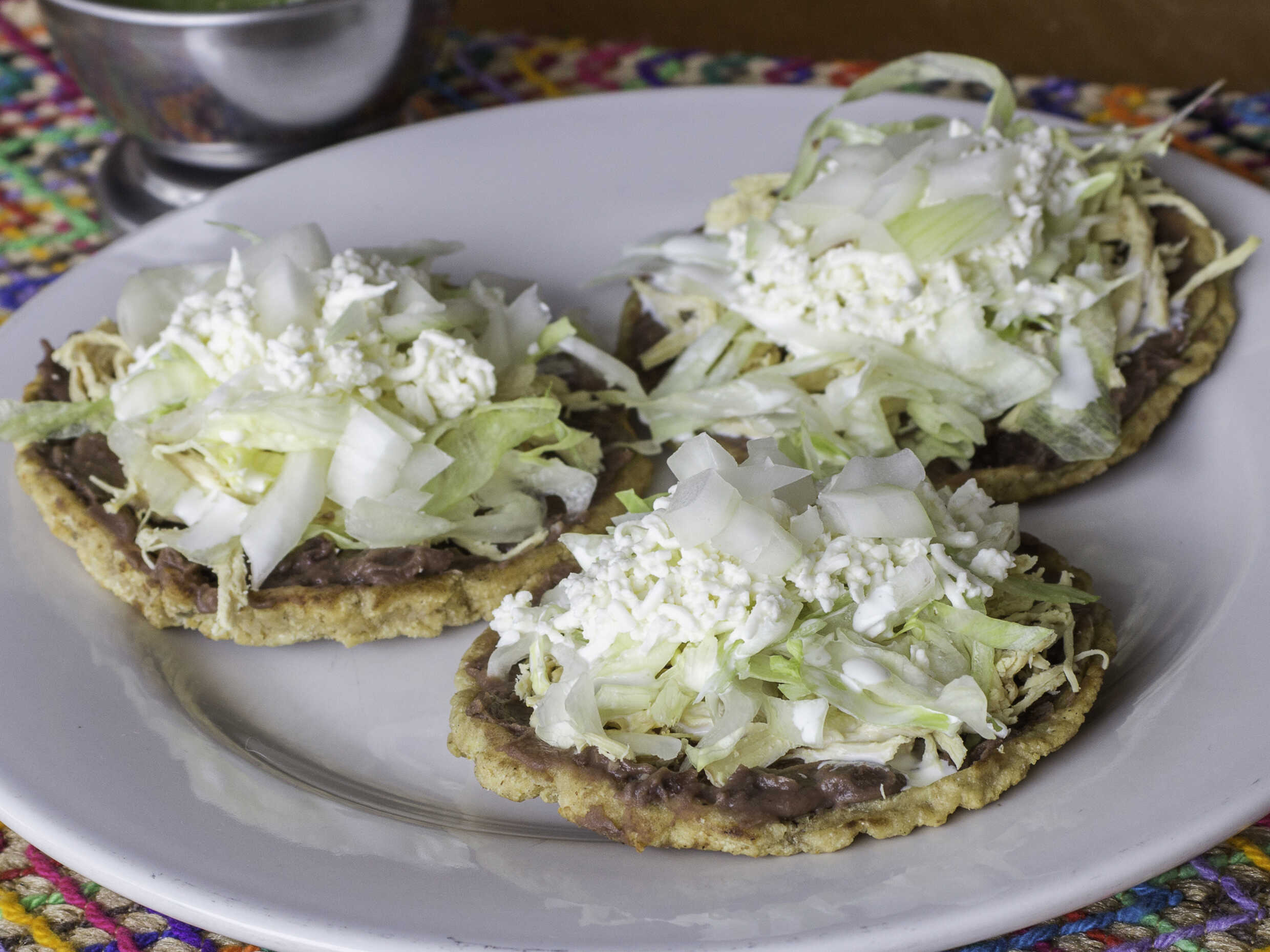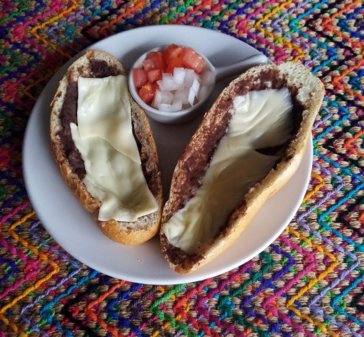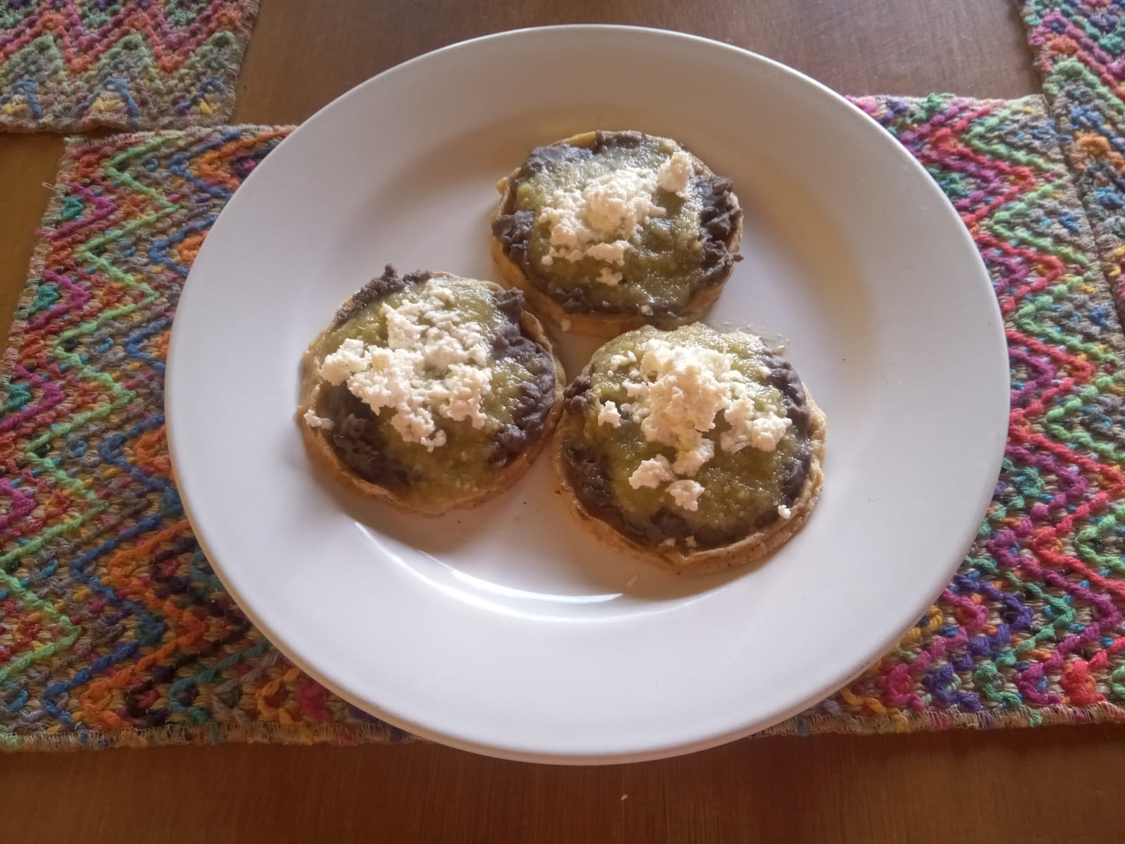 Tres pasas de pan dorados, cubiertos de frijol, queso gratinado y pico de gallo