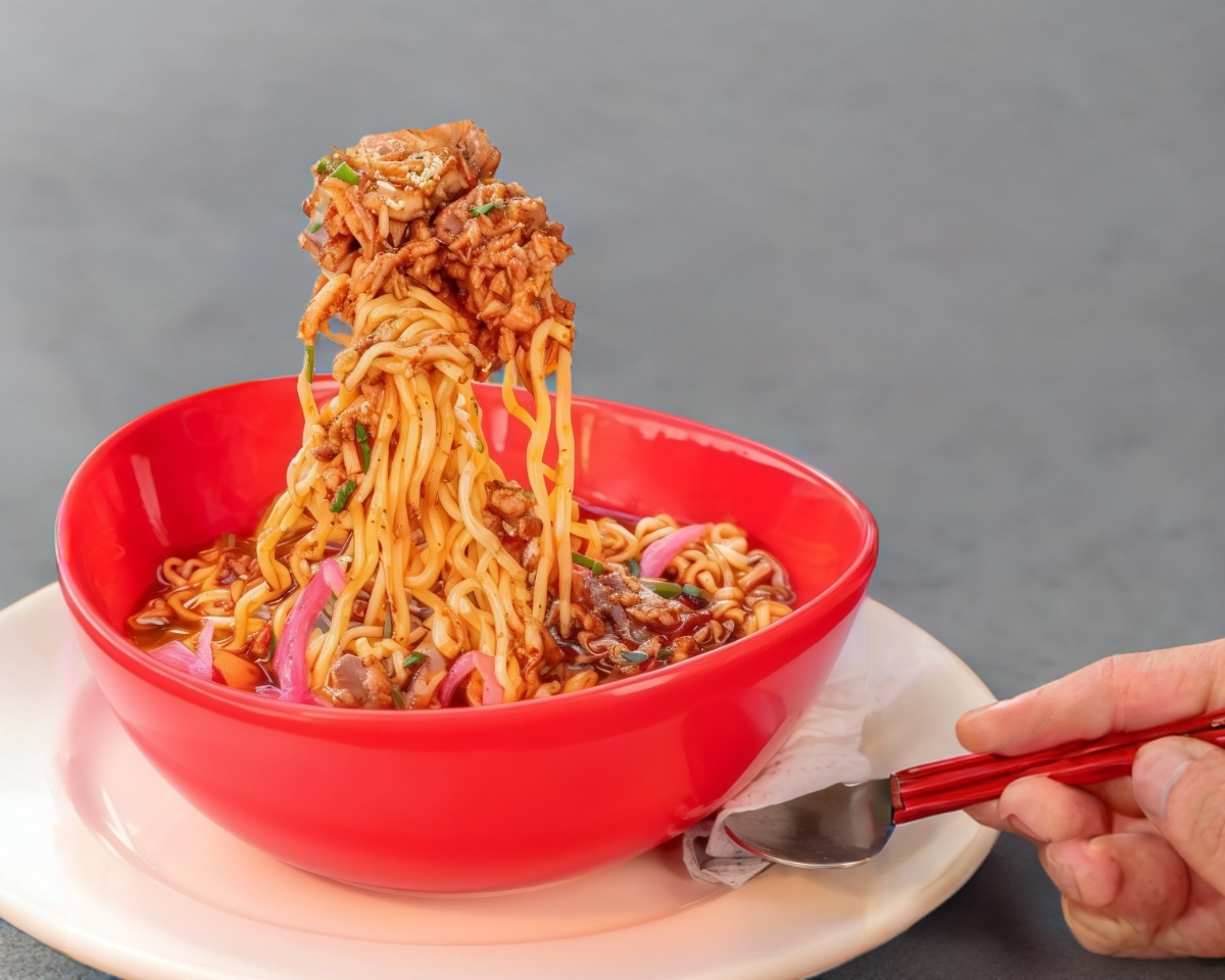 Fideos chinos (ramen) sobre consomé calientito acompañado de Birria Cornelio y un toque de cebollín y ajonjolí caramelizado.