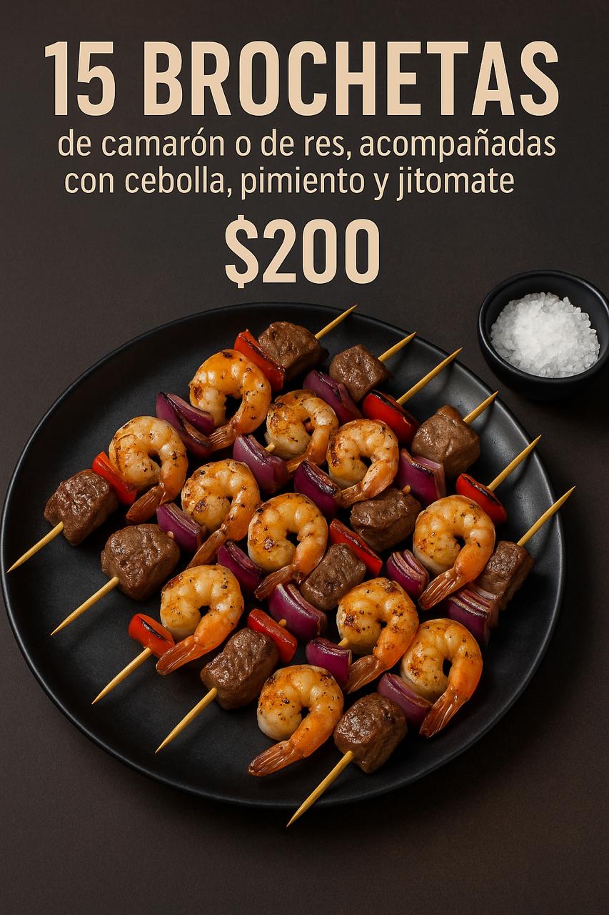 Brochetas de camarón o de res, acompañadas con cebolla, pimiento y jitomate.
