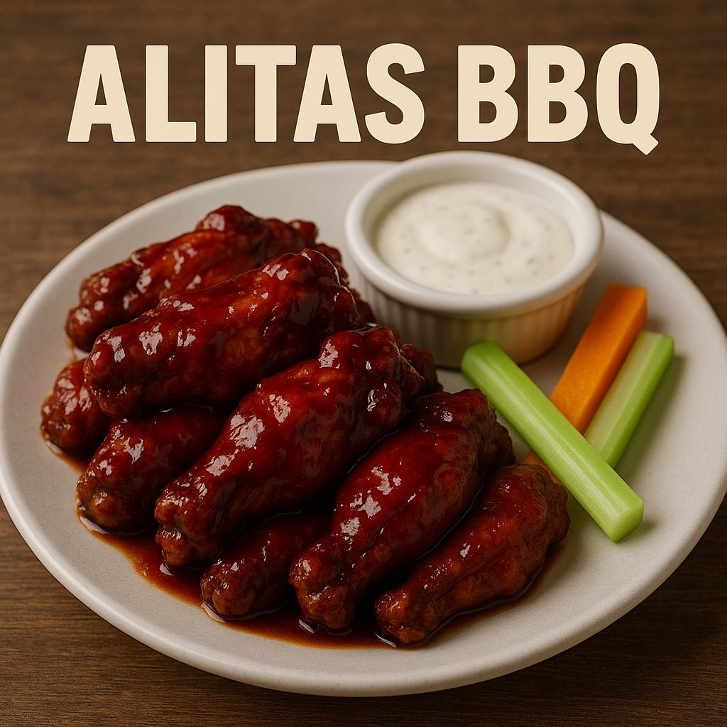 Alitas de pollo bañadas en salsa BBQ, acompañadas de papas a la francesa y salsa tártara.