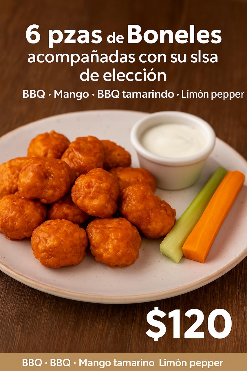 Crujientes trozos de pechuga de pollo sin hueso, perfectos para compartir o disfrutar solo, acompañados de tu salsa favorita. BBQ, Mango Habanero, BBQ Tamarindo, Lemon Pepper.