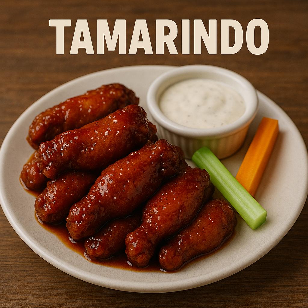 Alitas de pollo crujientes bañadas en salsa de tamarindo, acompañadas de papas a la francesa y salsa tártara.