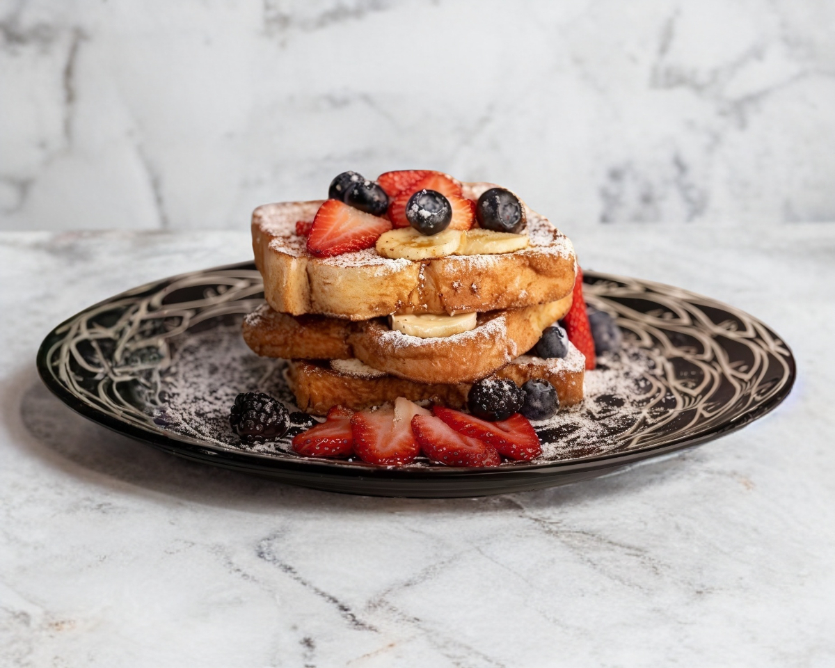2pz de pan brioche acompañados de platano, blue berrys fresa, líneas de miel mapple y un toque de azúcar glass
