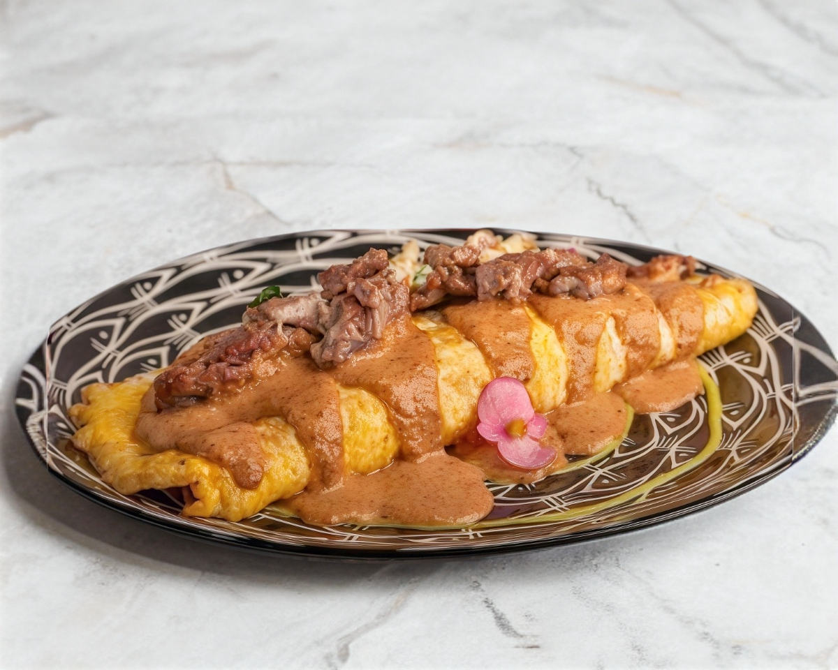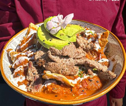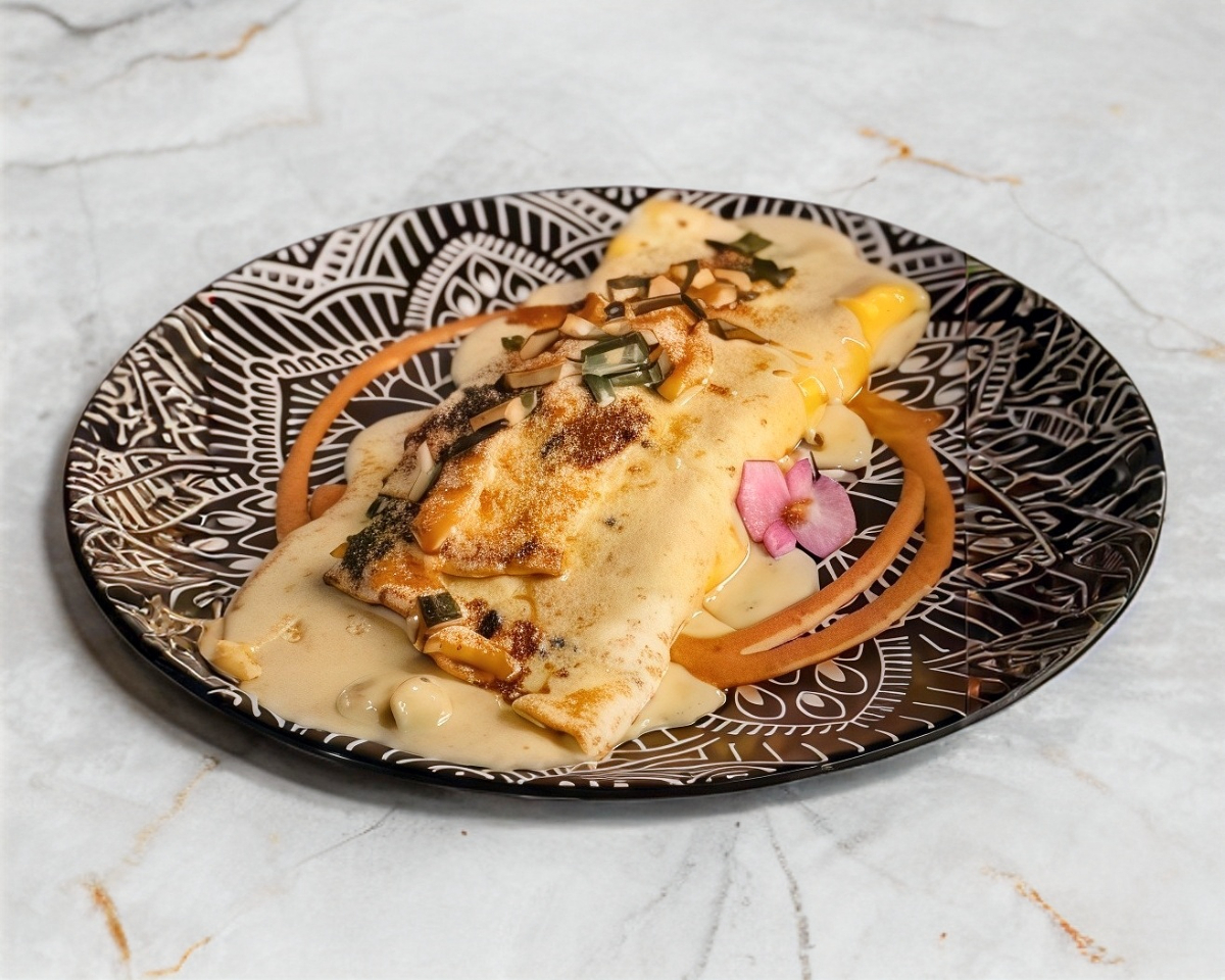Una tortilla francesa de huevo acompañada de arrachera, queso gratinado y un crocante de tortilla con un toque de espinaca acompañado de una salsa cremosa