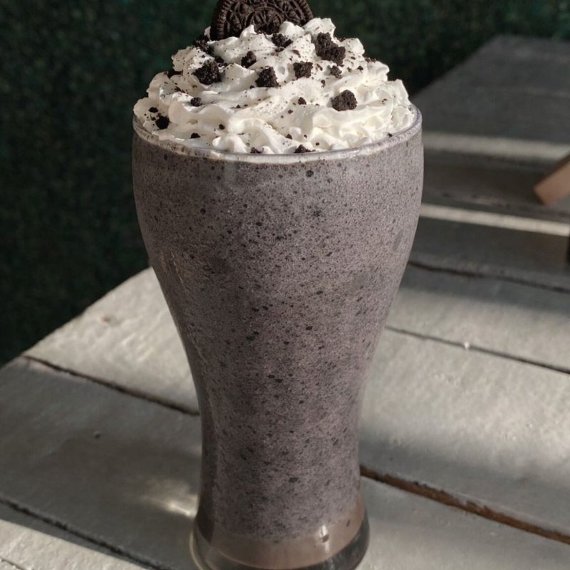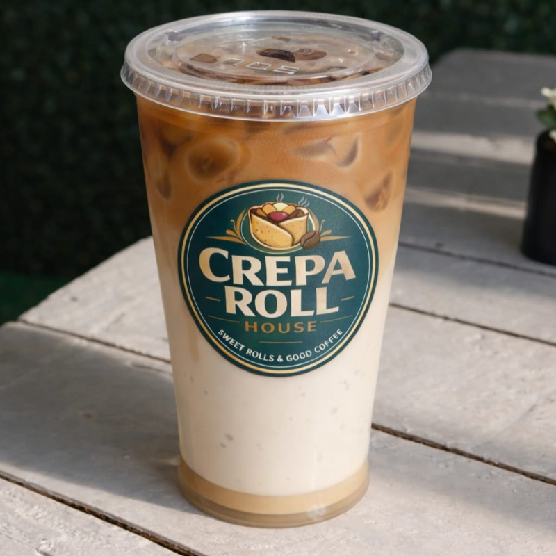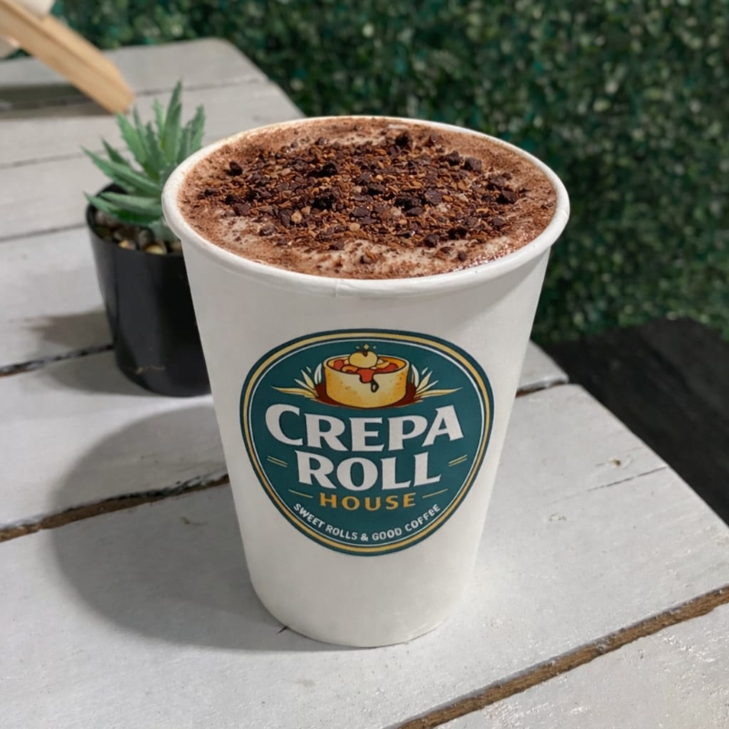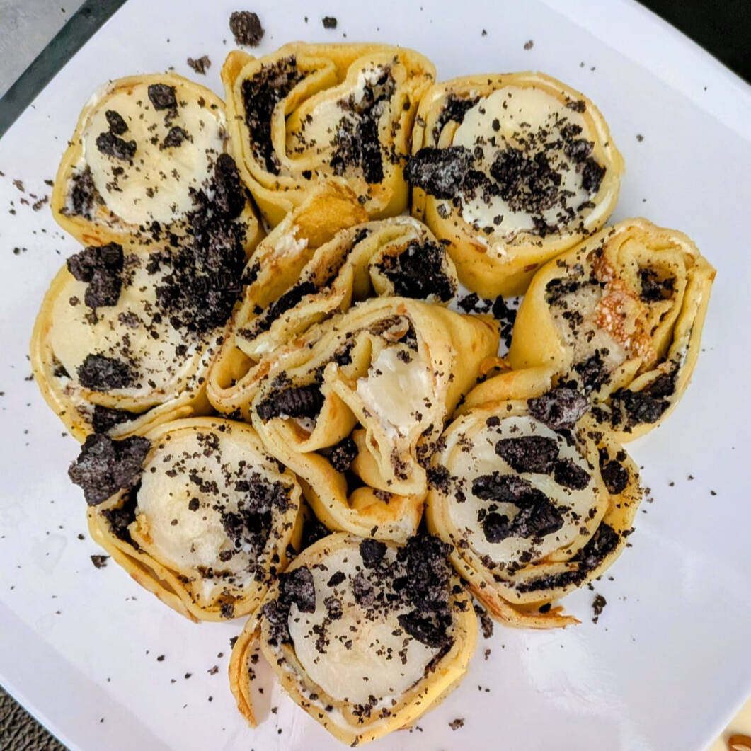 Crepa en forma de rollo hecha con plátano, galleta oreo, philadelphia y chocolate