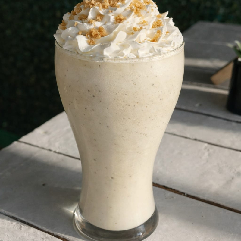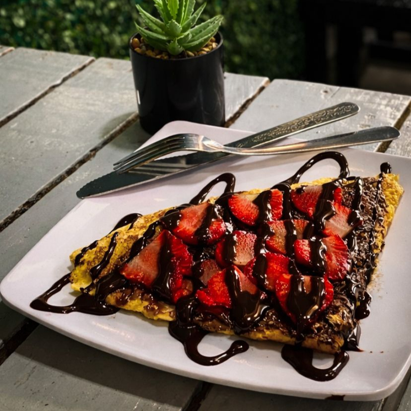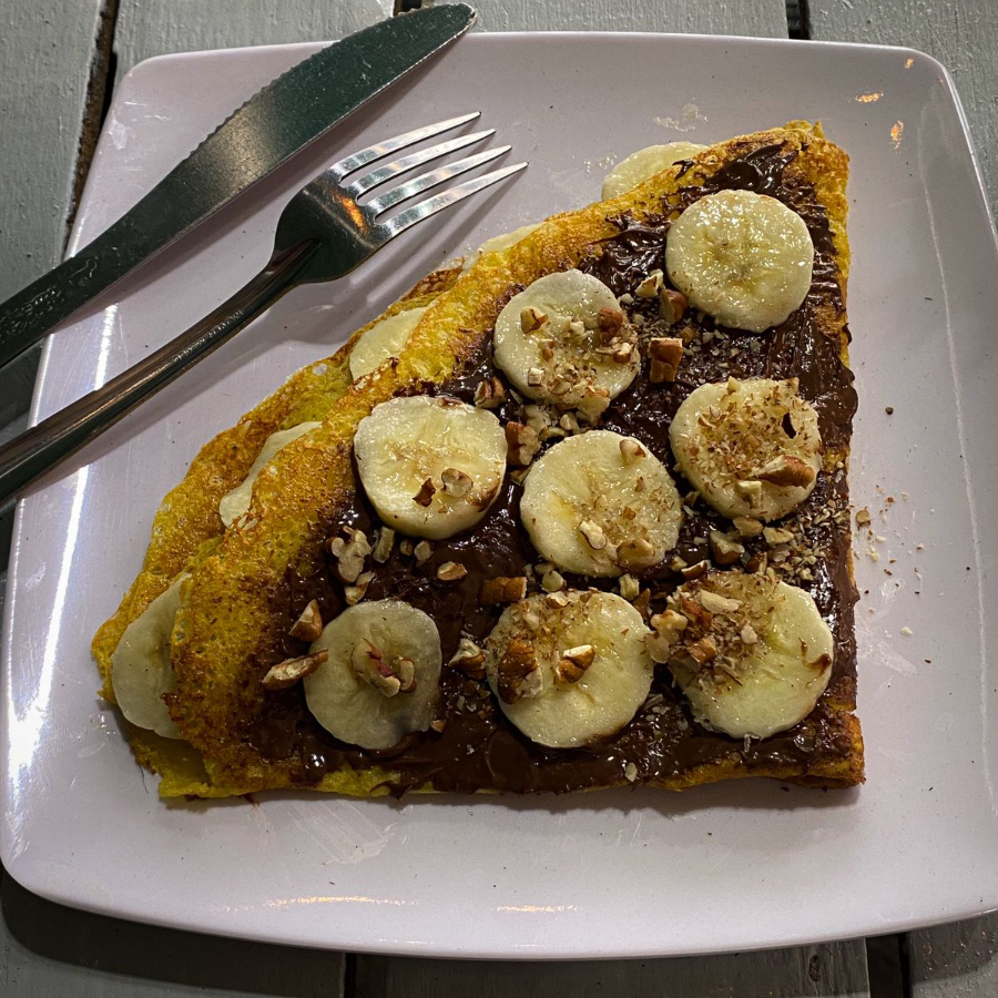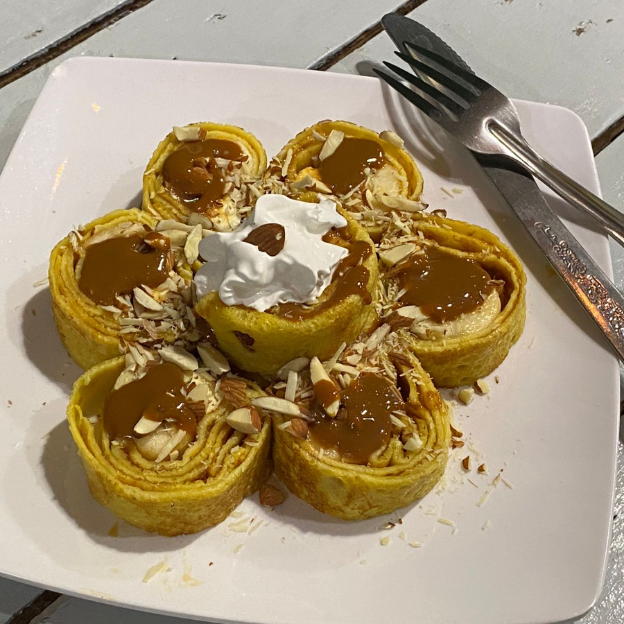 Crepa en forma de rollo hecha con platano, cajeta, nuces troceadas y philadelpia