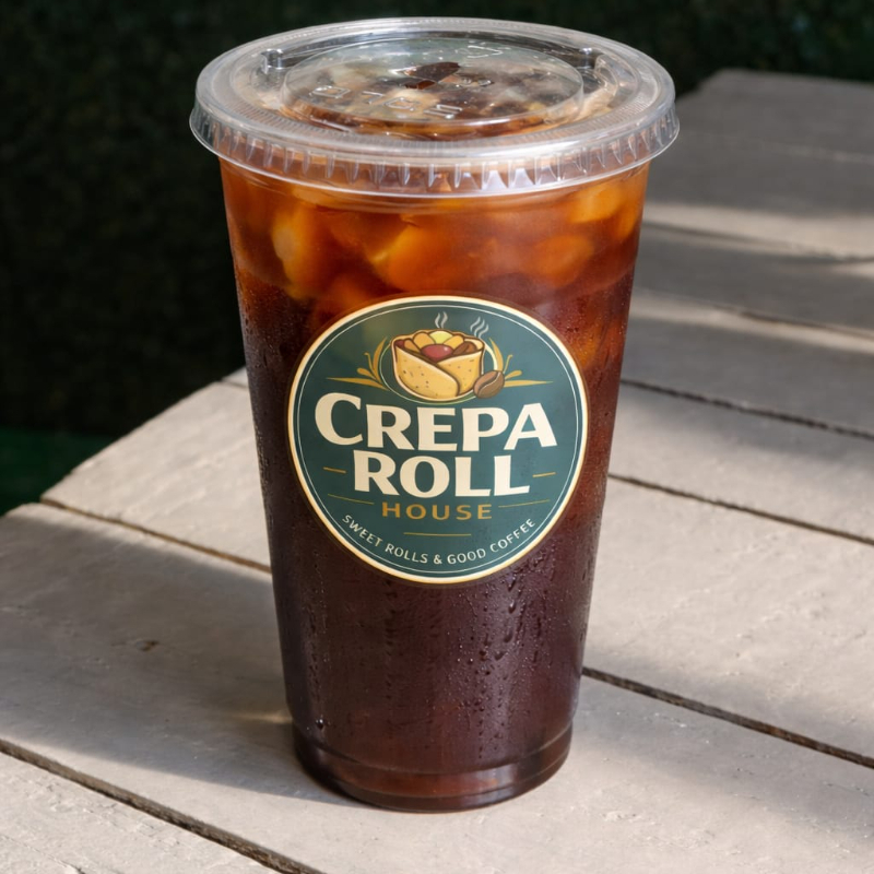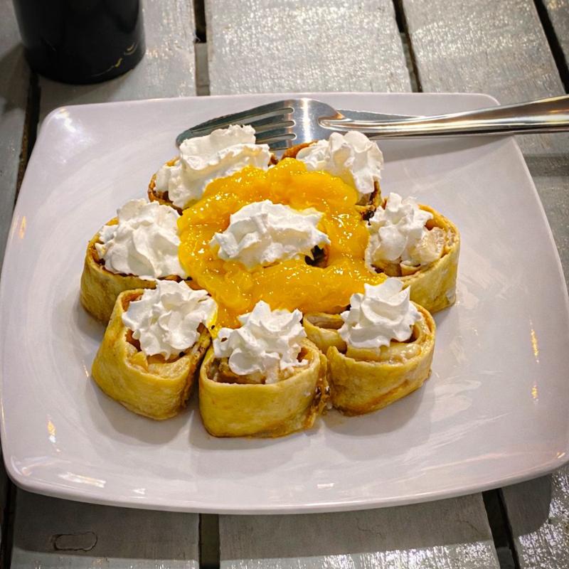 Crepa en forma de rollo hecha con mango en almibar, philadelpia, nueces y crema batida