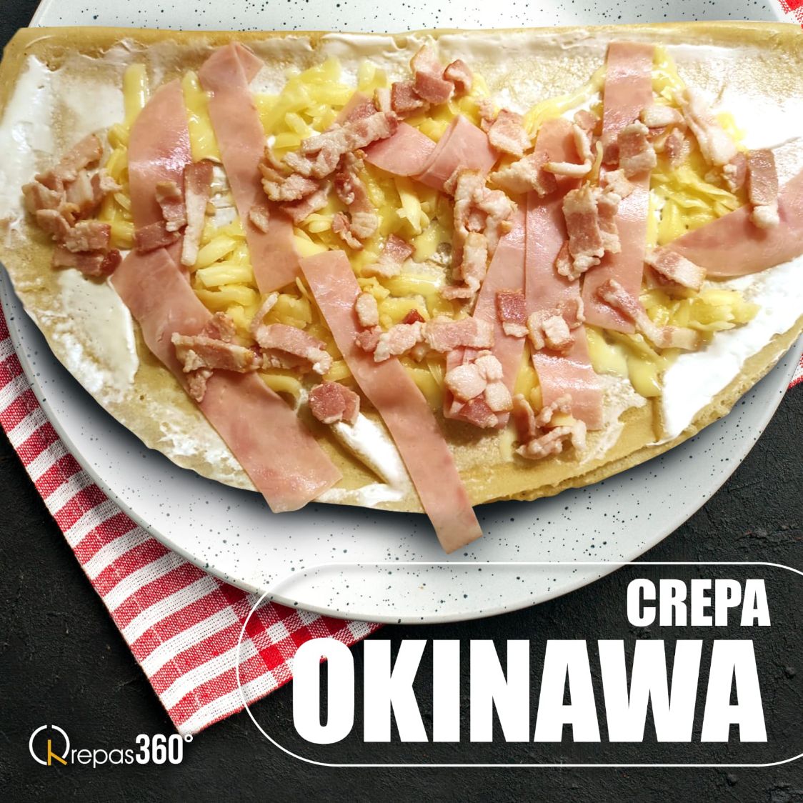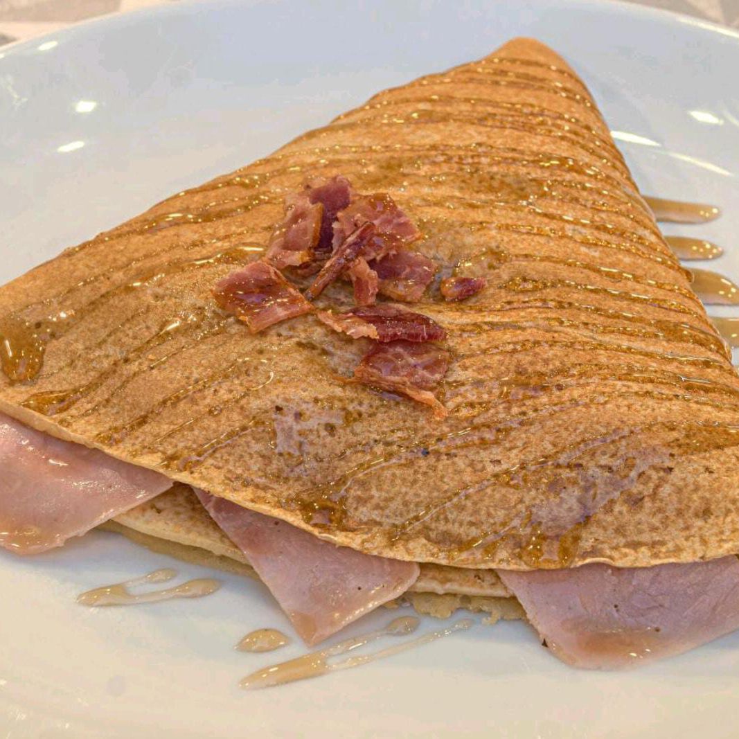 Crepa rellena con philadelphia, queso gouda, tocino ahumado y jamón de pavo