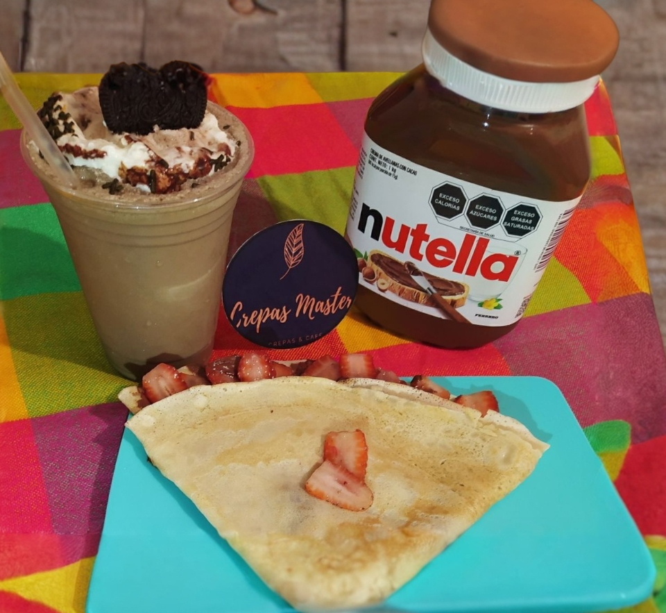 Crepa con crema de cacahuate con mermelada de fresa + topping