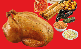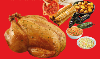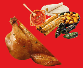 1 Pollo, 1 orden de papas, 1 orden de taco, 1 orden de arroz, 1 orden de sopa fría, 1/4 kg de tortillas, 1 orden de jalapeños y 1 salsa.