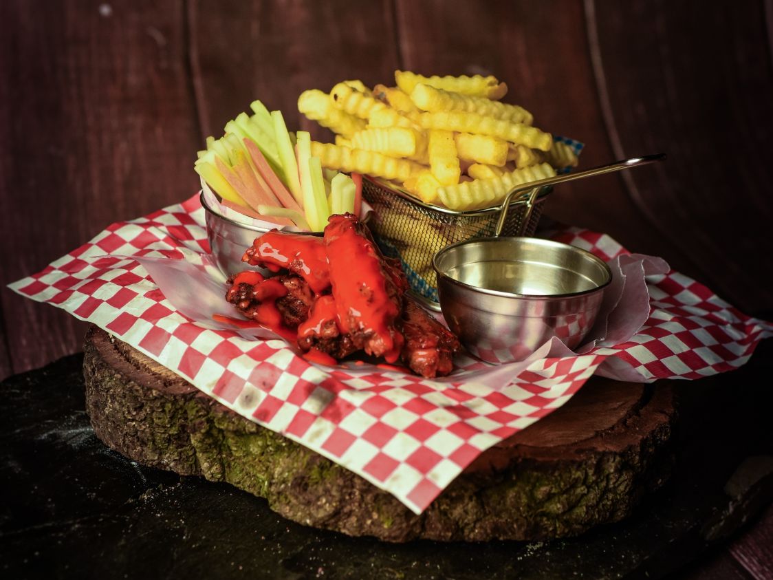 Acompañado de papas a la francesa, pepino, zanahoria y aderezo ranch.