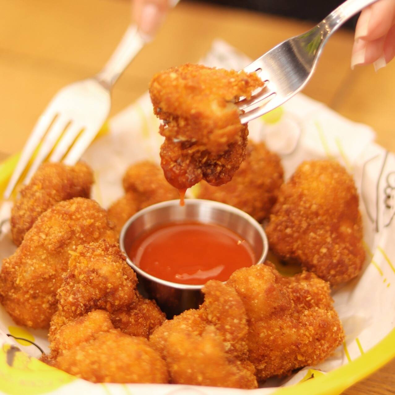 (Palomitas de pollo) crujientes y deliciosos, disfrútalos con el aderezo que más te guste.
