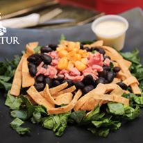 Cama de espinacas + tortilla frita + elote + frijol entero + tocino + aderezo chipotle con mayonesa+ vinagre balsámico