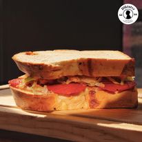 Medallón de pollo + jitomate+ lechuga + quesos mozzarella y queso manchego gratinado + aderezo chipotle con mayonesa