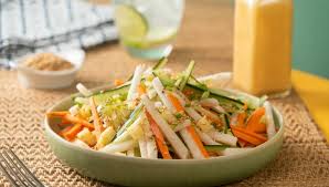 Cama de lechuga + jícama + zanahoria + salchicha de pavo + aderezo chipotle con mayonesa + vinagre balsámico