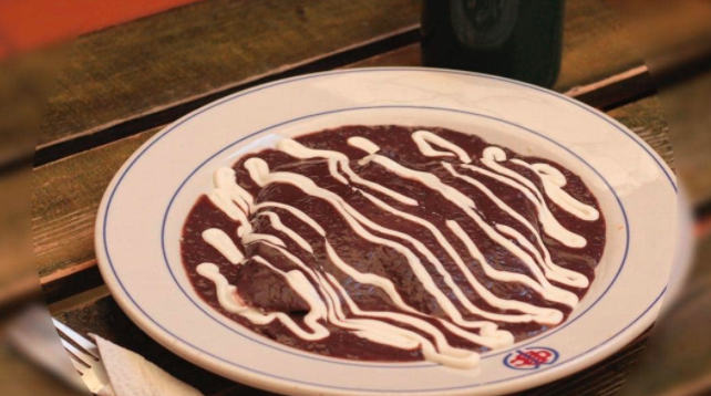 Bañada en dos salsas, acompañada de frijoles refritos, y crema.