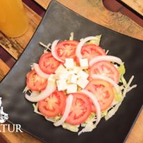 Tiras de res + tiras de pollo + salchicha + aderezo Tzatziki + papas a la francesa + jitomate + cebolla + lechuga