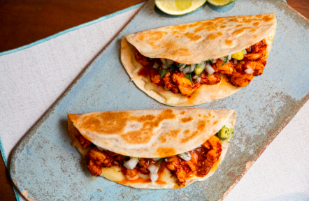 Tortilla de harina con queso, chorizo y cebolla cocida.