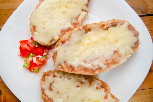 Telera partida en 4 piezas con frijoles de la casa, queso oaxaca y pico de gallo aparte.